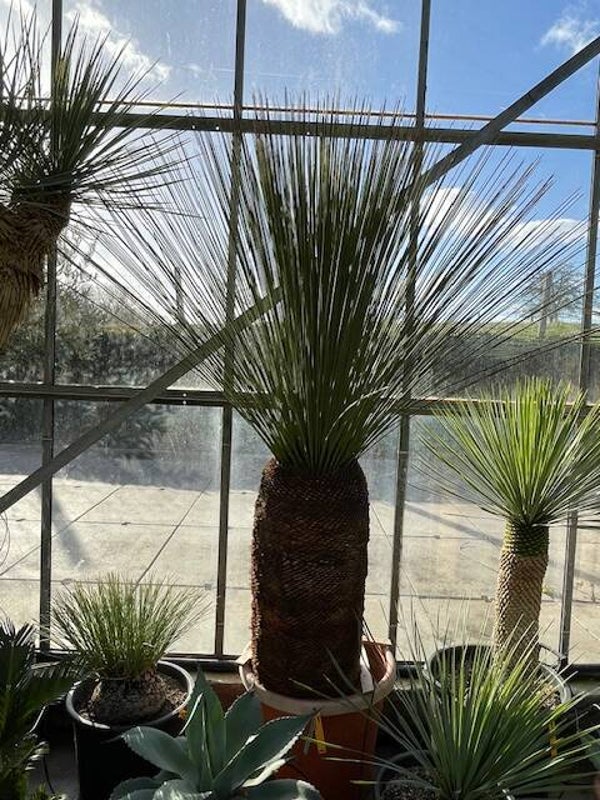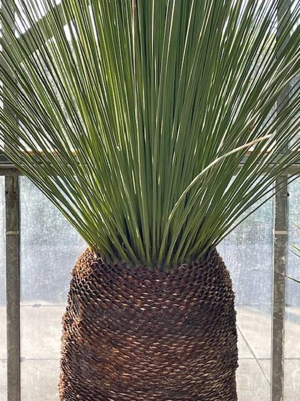 De stam bestaat uit oude bladeren die als uienschillen op elkaar liggen. Houder de boom hoe hoger de stam. De bladerkroon hangt elegant naar beneden. Het blad is lineair en wordt wel 120 cm lang en staat in ringen om de stam heen. Het is een langzaam groeiende schoonheid.