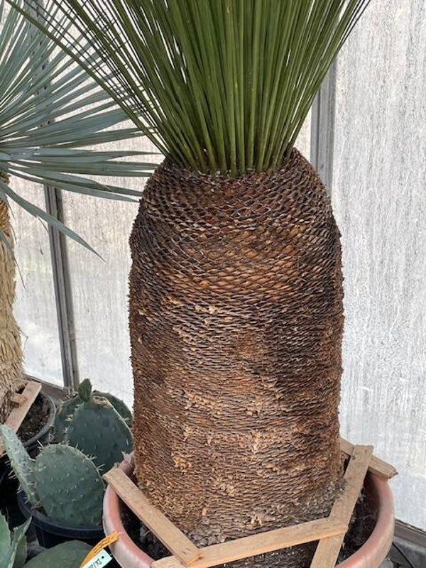 De stam bestaat uit oude bladeren die als uienschillen op elkaar liggen. Houder de boom hoe hoger de stam. De bladerkroon hangt elegant naar beneden. Het blad is lineair en wordt wel 120 cm lang en staat in ringen om de stam heen. Het is een langzaam groeiende schoonheid.