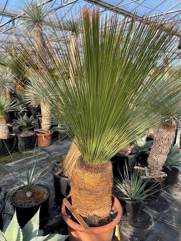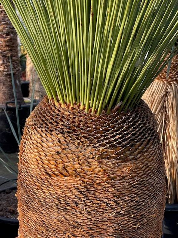 De stam bestaat uit oude bladeren die als uienschillen op elkaar liggen. Houder de boom hoe hoger de stam. De bladerkroon hangt elegant naar beneden. Het blad is lineair en wordt wel 120 cm lang en staat in ringen om de stam heen. Het is een langzaam groeiende schoonheid.