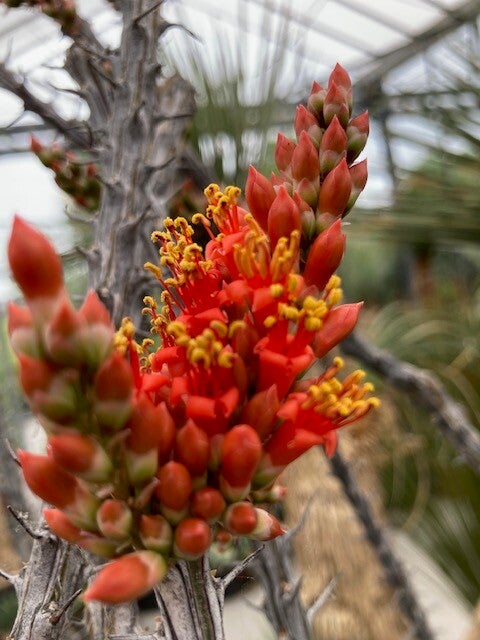 In het voorjaar produceert Fouquieria splendens felrode bloemen aan het uiteinde van de stengels.