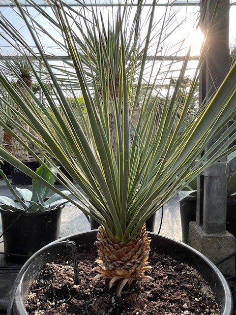Deze yucca is sterk verwand aan de Yucca rostrata.De bladeren zijn echter stijver, getand, korter en iets minder blauw dan die van de Rostrata. Na verloop van tijd zullen de onderste bladeren afsterven en als een rok rond de stam hangen.