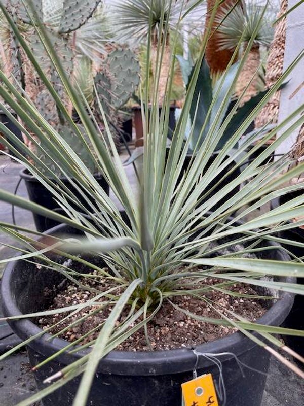 Deze yucca is sterk verwand aan de Yucca rostrata.De bladeren zijn echter stijver, getand, korter en iets minder blauw dan die van de Rostrata. Na verloop van tijd zullen de onderste bladeren afsterven en als een rok rond de stam hangen.