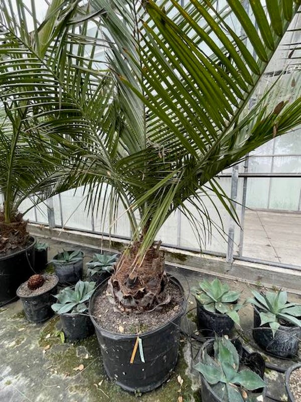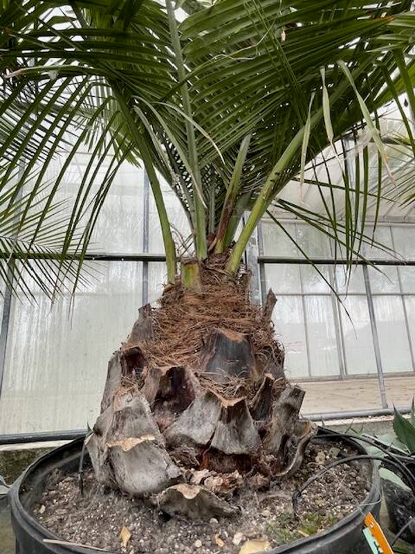 De Jubaea chilensis is afkomstig uit Chili. Deze grote vederpalm wordt gekenmerkt door een bijzonder dikke stam, de kroon bestaat uit stijve gevederde bladeren.