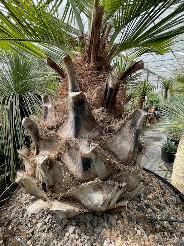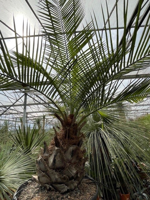 De Jubaea chilensis is afkomstig uit Chili. Deze grote vederpalm wordt gekenmerkt door een bijzonder dikke stam, de kroon bestaat uit stijve gevederde bladeren.
