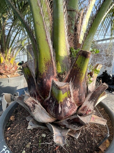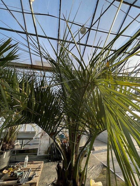 De Butia capitata of geleipalm is een wintergroene palmboom afkomstig uit Zuid-Amerika. De grote grijsgroene/blauwgrijze bladeren hangen wat af.