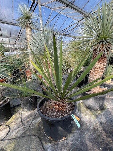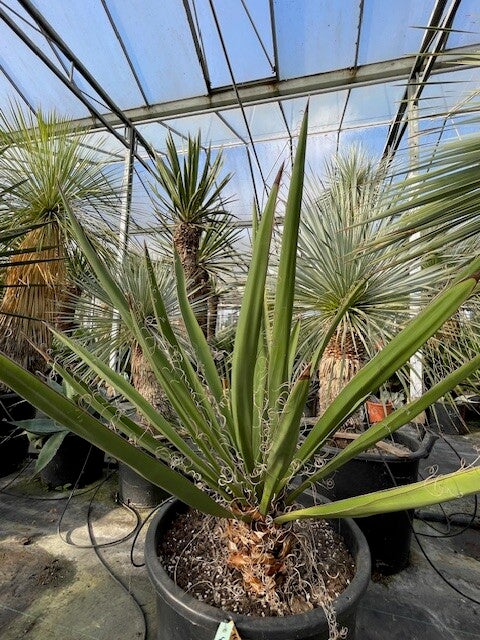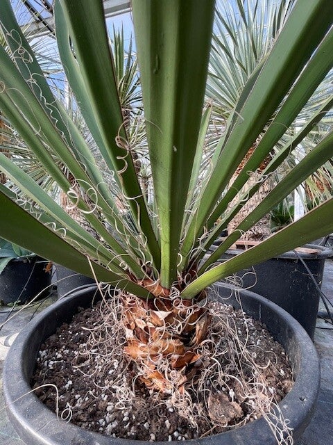Deze redelijk snelgroeiende yucca produceert meestal één enkele zeer dikke stam. Deze heeft een donkerbruine kleur. Zijn bladeren zijn brede speervormige donkergroene bladeren met sierlijke draden langs de rand van het blad. Hij heeft ruimte nodig om zich te ontwikkelen daar hij in de vrije natuur een hoogte van 10 meter kan bereiken.
