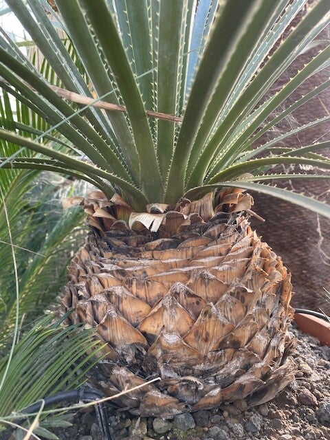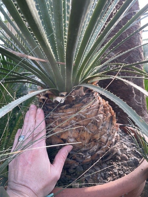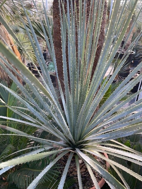Deze robuuste soort uit het noordoorsten van Mexico heeft mooie blauwe bladeren met kleine stekels.Zijn sierlijke symmetrische kroon staat bovenop een korte, gedrongen stam.