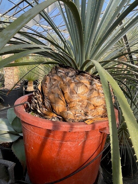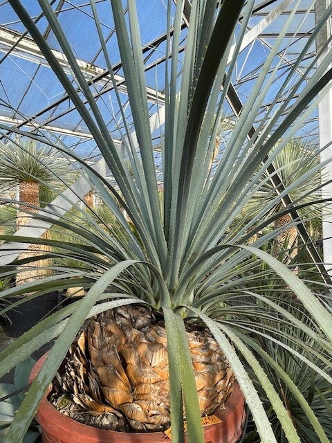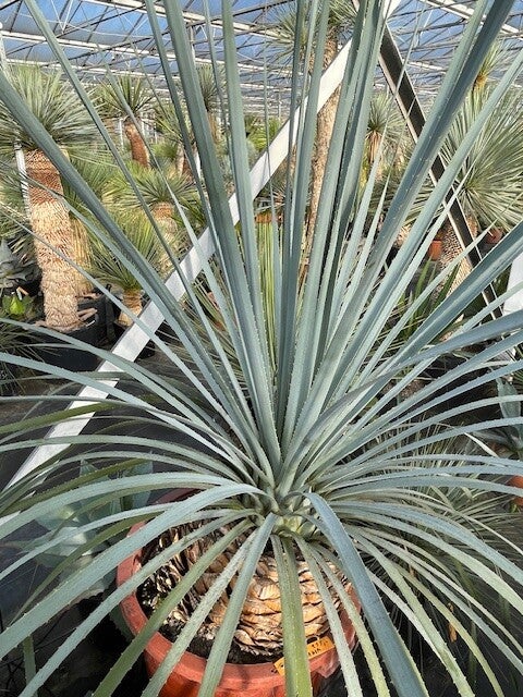 Deze robuuste soort uit het noordoorsten van Mexico heeft mooie blauwe bladeren met kleine stekels.Zijn sierlijke symmetrische kroon staat bovenop een korte, gedrongen stam.